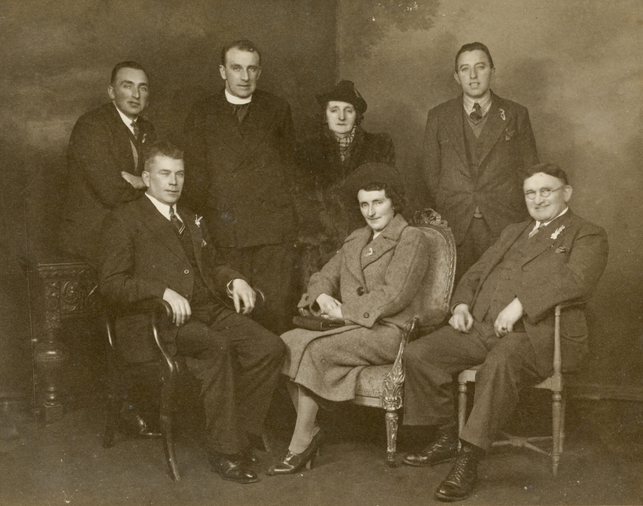 The McDaid’s pose together for a family photo. From the left standing: Anthony McDaid, Fr. Joseph McDaid, Peggy McDaid and John McDaid. Seated from left to right: John Patrick Doherty, Frances McDaid and Hugh McDaid.