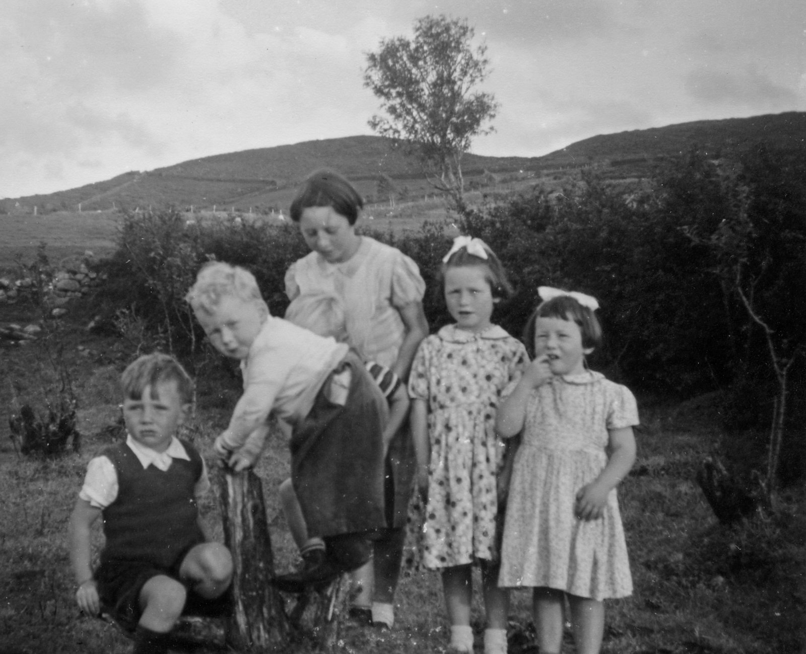 McGing children with neighbours, at their family home. From left: John Collins, Austin McGing (Jr), Peter Collins (possibly), Mary McGing, Anne McGing, Kathleen McGing. c. 1959