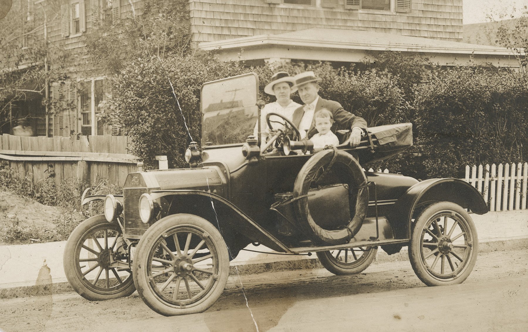 Anne McGovern Meenagh (b. County Cavan) and her husband Felix Meenagh (b. County Tyrone) in Narragansett, Rhode Island, on a day out to the beach, 1915. Felix bought the car, a Model T Ford, though he didn't know how to drive. The baby is Anna Meenagh, Brian's mother (b. 1912). This photo was made into a postcard and sent back to family in Tyrone.