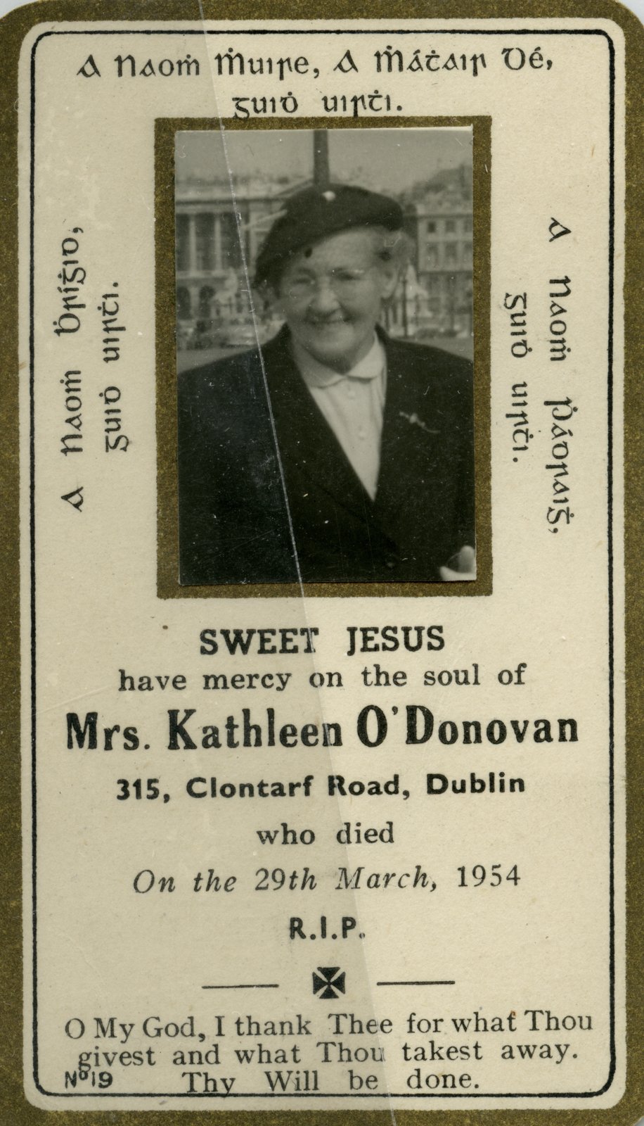 Mass card of Kathleen O’Donovan (née Boland), wife of Senator Sean O’Donovan, brother of Con O’Donovan. ‹ Previous Mass card of Edward O’Sullivan, husband of Margaret O’Sullivan (née O’Donovan), sister of Con O’Donovan. Next › Grandmother of Daniel Scully Mass card of Kathleen O’Donovan (née Boland), wife of Senator Sean O’Donovan, brother of Con O’Donovan.