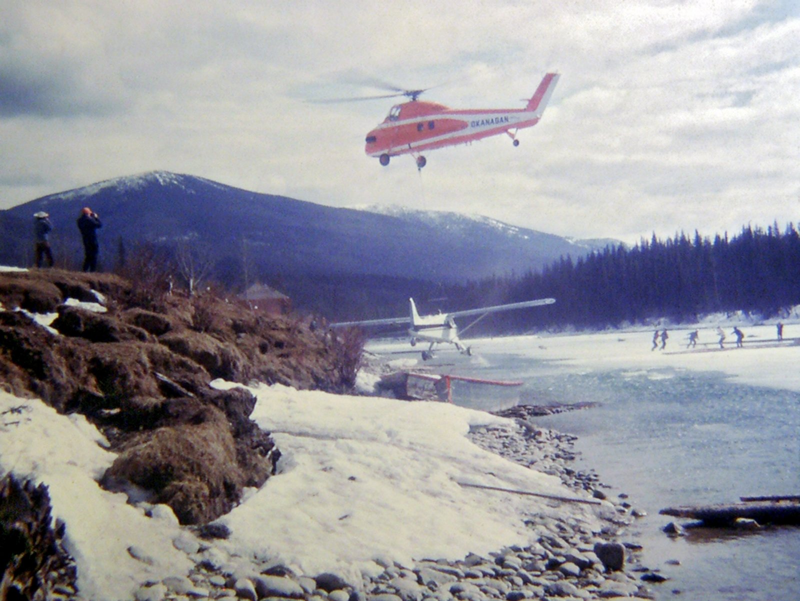 Helicopter is brought in to move the plane back on to the ice, men on the right helping with a rope to keep the plane from being blown back into river bank, March 1973.